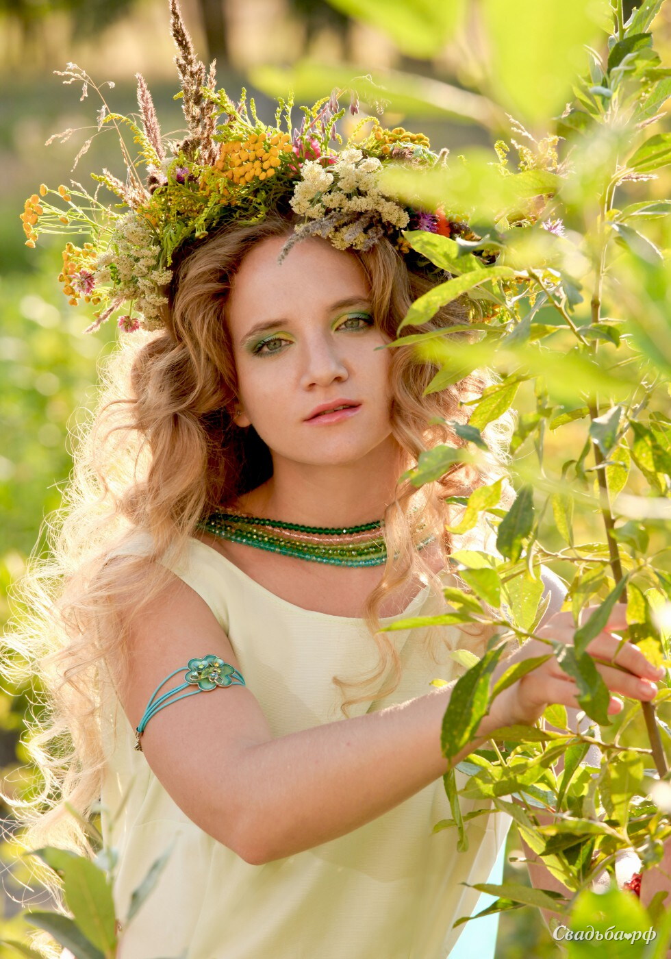 Естественность не выходит из моды! Нежная свадебная причёска на длинных распущенных волосах подчеркнёт Вашу природную красоту. Каждая прядь аккуратно завита в мягкий локон, струящийся вдоль спины. В качестве декора использован яркий венок из живых цветов и трав. Причёска подходит практически любому типу лица. Причёска продержится весь праздник.