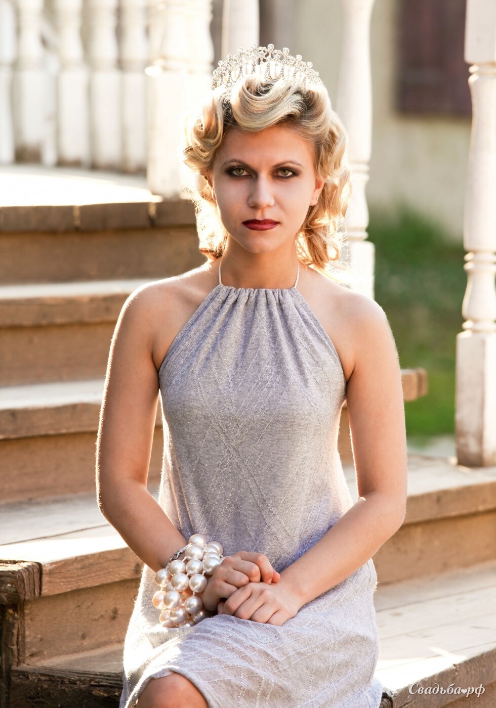 Оригинальная свадебная причёска в винтажном стиле выполнена на длинных волосах. Лицо обрамляют эффектные волны, надёжно зафиксированные лаком. Сзади пряди завиты и уложены в объёмную конструкцию на уровне шеи. Украшает представленную причёску сверкающая диадема. Такой вариант акцентирует внимание на лицо и плечики невесты.