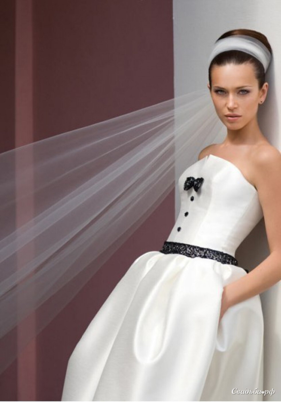 Элегантная свадебная причёска выполнена в духе 60-х годов. Волосы гладко зачёсаны назад и зафиксированы в объёмную шишку. Укладка акцентирует внимание на лице и плечиках невесты, зрительно вытягивает силуэт и придаёт несколько сантиметров роста. Причёска дополнена широкой кружевной полосой и длинной фатой.