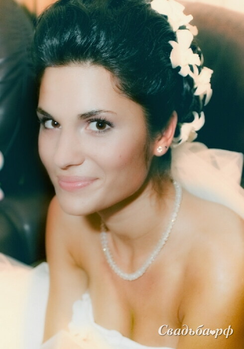 Никогда не устаю напоминать своим клиенткам, что слово невеста происходит от слова невинность! Поэтому нежность, свежесть и подчёркнутая естественность не повредит даже самым ярким и стильным девушкам, скорее наоборот — подчеркнёт их индивидуальность. Эта причёска с собранными волосами подходит вытянутому личику. Изящные кудри на макушке украшены цветами.