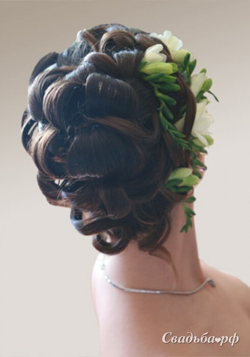 Свадебная причёска с собранными волосами украшается живыми цветами, диадемой или заколками. Локоны собираются на затылке и укладываются в широкие кудри, едва касающиеся шеи. Такая модель выполняется на средних или длинных волосах. Отличный вариант для платья с открытой зоной декольте. Достаточно трудоёмкая причёска.