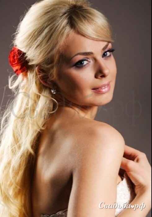 Какой должна быть свадебная причёска для создания естественного, романтичного и одновременно рокового образа современной невесты 21 века? Длинные распущенные волосы с лёгкими локонами и живая роза яркого красного цвета! Кокетливая чёлочка убрана набок, волосы слегка зафиксированы сзади. Представленная модель подходит любому типу лица.