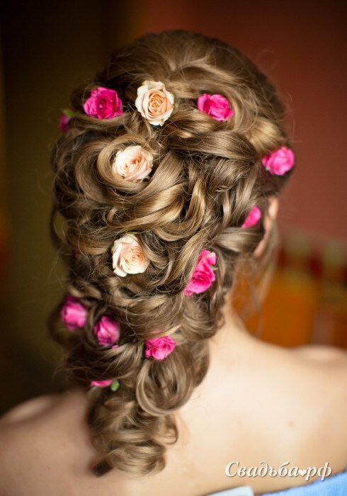 Если Вы мечтаете о романтичной, стильной и неповторимой свадебной причёски, то эта модель просто создана для Ваших локонов! Волосы зачёсаны назад, завиты и искусно переплетены между собой. Эта объёмная конструкция украшена живыми розочками. Вашей красоте и молодости позавидует сама весна! Укладка для длинных и ухоженных волос.