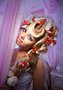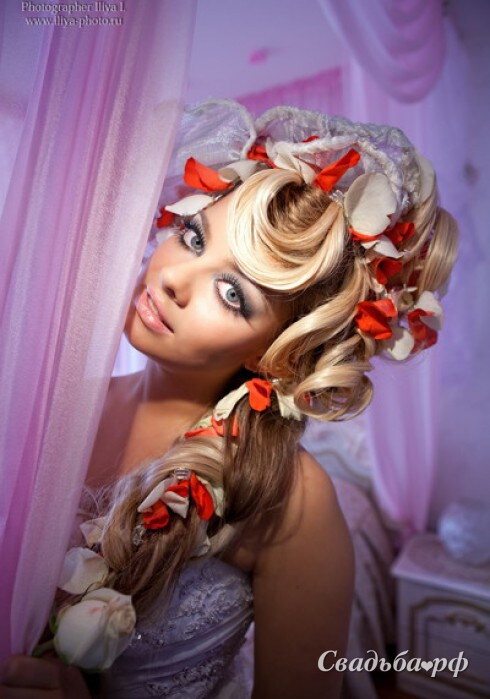 Участие в параде невест. Стилизованный образ Аленький цветочек. Для этой свадебной прически использовались дополнительные натуральные волосы разных оттенков от белого до натурально-русого цветов. Пряди завиты в широкие локоны и заплетены в оригинальную косу. Украшена такая затейливая композиция лепестками роз и кокетливой дизайнерской шляпкой.