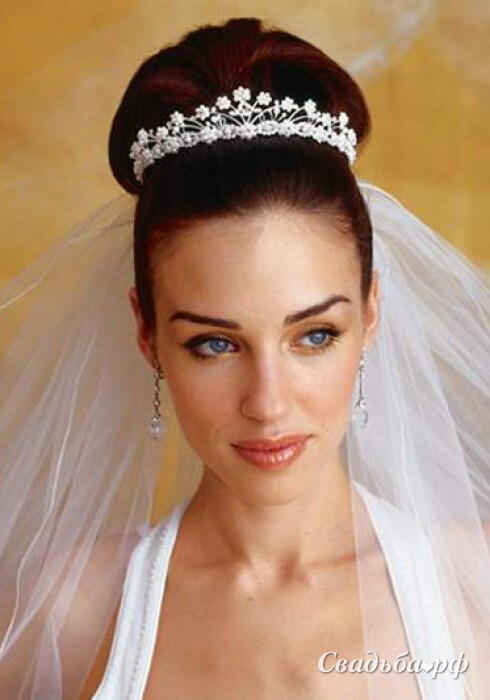 Изысканный и лаконичный образ Одри Хепберн предпочитают самые стильные невесты. Гладко зачёсанные волосы и объёмная шишка на затылке акцентируют внимание на лице и стройной шее красавицы. Сверкающая диадема и лёгкая фата придают укладке романтичность. Отличный вариант для длинных волос. Причёска подходит вытянутому или худенькому личику.