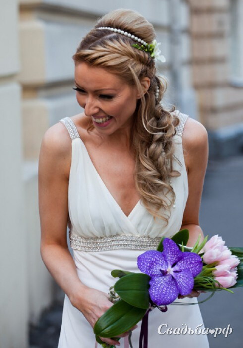 Свадебная причёска в греческом стиле – это беспроигрышный вариант для стильной и уверенной в себе невесты. Лоб обрамлён оригинальным плетением. Часть волос зачёсана и приподнята на затылке. Роскошные локоны каскадом падают на плечи и струятся вдоль спины. Нить благородного жемчуга и миниатюрные цветы украшают эту укладку.