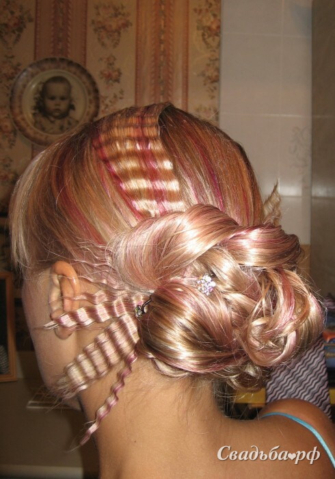 Свадебная причёска с собранными волосами и гофрированными прядями смотрится оригинально. Эта модель выполняется на длинных и средних волосах. Локоны зачёсываются в пучок ниже затылка и искусно переплетаются между собой, создавая дополнительный эффект. Торчащие пряди придают укладке особый шик. Такая причёска сочетается с коротким платьем.