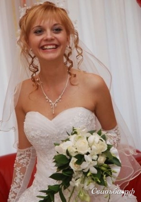 Свадебная причёска с фатой и лёгкой чёлкой отлично смотрится со всеми типами лица. Такую укладку можно выполнить практически на любых волосах. Часть локонов зачёсывается назад и фиксируется на затылке. Остальные пряди завиваются и свободно струятся. Модель дополняется цветами, бусинами и миниатюрными заколками.