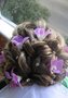 Свадебная причёска с живыми цветами и лёгкой фатой поможет создать весенний образ. Волосы зачёсываются и фиксируются на затылке. Затейливое переплетение уложенных в объёмную шишку локонов дополняется бусинами. Такая пышная модель выполняется на средних и длинных волосах. Причёска добавит несколько сантиметров росту невесты.