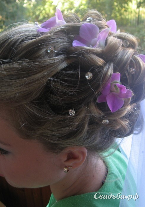 Свадебная причёска с фатой и живыми цветами подходит практически любому типу лица. Длинные или средние волосы зачёсываются назад и фиксируются на затылке. Оригинально переплетённые между собой локоны украшаются бусинами, сверкающими заколками. Модель смотрится естественно и продержится в идеальном состоянии целый день.