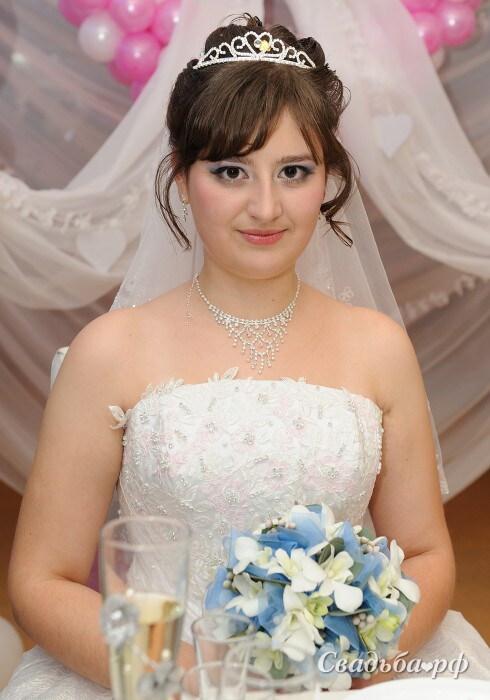 Свадебная причёска с чёлкой и сверкающей диадемой роскошно смотрится со всеми типами лица. Волосы зачёсываются назад и надёжно фиксируются на затылке. Несколько свободных прядей придают образу лёгкость и романтичность. Такая укладка выполняется на любой длине волос. Эту причёску можно дополнить нежной фатой.