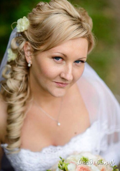 Великолепная причёска в греческом стиле подчеркнёт не только красоту Ваших волос, но и Ваш безупречный вкус. Длинная чёлка убрана набок. Пряди зачёсаны назад и легко зафиксированы на затылке. Роскошные локоны струятся вдоль спины и падают на плечи. Полупрозрачная фата и несколько живых цветов придают образу особый шик.