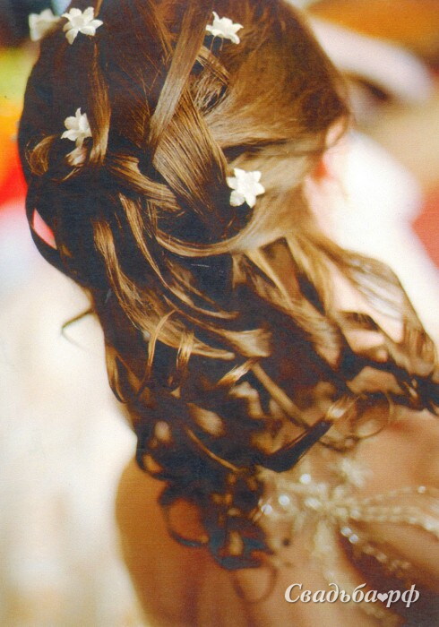 Естественная и свежая причёска для юных душой невест. Волосы забраны назад и небрежно переплетены между собой. Основные локоны струятся свободных каскадом на плечи. Модель дополнена миниатюрными живыми цветочками. Не стоит перегружать эту модель декором. Сама весна позавидует Вашей молодости и красоте! Отличный вариант для любого типа волос.