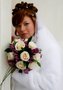 Романтичная свадебная причёска с нежной фатой и миниатюрными заколками-цветочками подойдёт любому типу лица. Волосы зачёсаны назад и зафиксированы на затылке в объёмную конструкцию из пышных локонов. Густая чёлка убрана набок. Несколько прядей, словно случайно, выбились из общей композиции. Оптимальный вариант для средних волос.