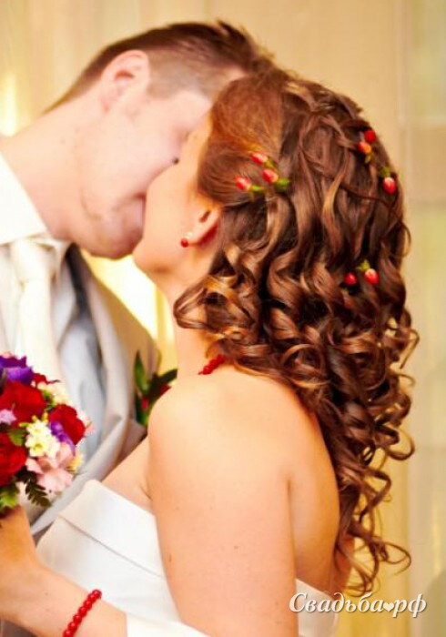 Если Вы – обладательница длинных и ухоженных волос, то свадебная причёска с распущенными локонами создана специально для вас! Пряди зачёсаны назад, завиты в мягкие кудряшки и украшены миниатюрными живыми цветами. Всё! Больше никаких украшений, страз и корон! Такая лаконичность и естественность смотрится прекраснее тысячи бриллиантов!