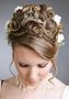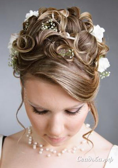 Классическая свадебная причёска с забранными наверх волосами поможет создать весенний образ прекрасной невесты. Широкая прядь пересекает лоб и фиксируется на боку. Несколько изящных прядей обрамляют виски. Очаровательные локоны на затылке украшены живыми розочками и миниатюрными белыми веточками. Вариант для средних по длине волос.