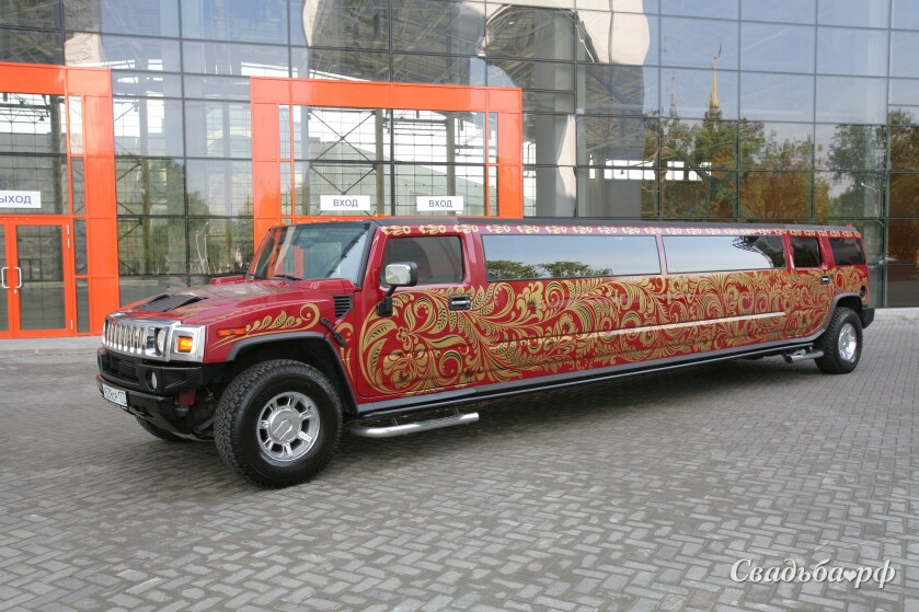 Яркий и ультрасовременный лимузин Hummer H2 Limousine с легкостью подчеркнет Вашу индивидуальность и особый неповторимый стиль. Автомобиль с нестандартным цветовым решением в виде золотого орнамента "под хохлому" на кузове бордового цвета, не останется незамеченным окружающими. В салоне лимузина, оборудованном всем необходимым, могут комфортно расположиться 20 пассажиров.