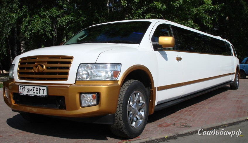 Роскошный лимузин Infiniti, QX-56 с бело-золотым кузовом вместит всех ваших друзей, ведь он рассчитан на 20 пассажиров. Панорамные окна с тонированными стёклами уберегут вас от чужих взглядов. Кожаный салон цвета экстра голд с коричневыми вставками дополнен диско-полом, потолком с подсветкой, видео-аудио-стерео-системой, баром и кондиционером.