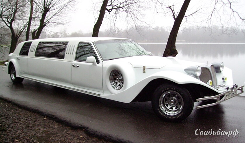 Оригинальный лимузин Excalibur Phantom с элегантным белоснежным кузовом, тонированными окнами и хромированными деталями придётся по вкусу настоящим ценителям ретро-стиля. Представленный автомобиль с комфортабельным кожаным салоном на 11 пассажиров оборудован всем необходимым для незабываемого торжества: CD, DVD, баром, звездным небом.