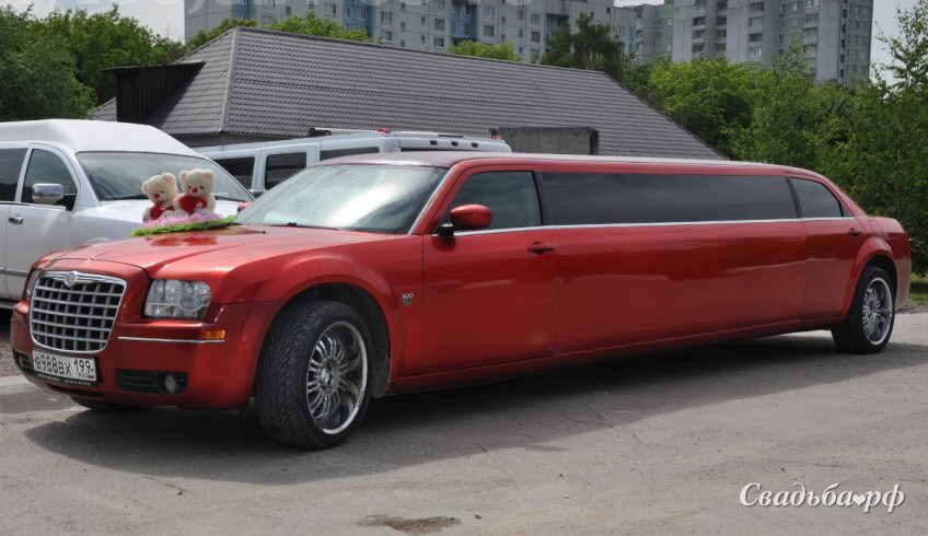 Королевский лимузин Chrysler 300C с насыщенным вишнёвым кузовом и панорамными тонированными окнами придётся по душе самым дерзким и стильным молодожёнам. Этот красавец с красно-чёрным кожаным салоном рассчитан на 10 пассажиров и оборудован CD, DVD, ЖК-TV, звездным небом, баром. Данный автомобиль можно заказать со скидкой.