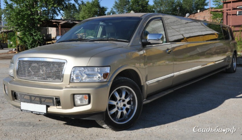Серебристый лимузин Infiniti QX с панорамными тонированными окнами сделает ваше торжество оригинальным и незабываемым. Роскошный кожаный салон в коричнево-бежевых тонах рассчитан на 22 пассажира и оборудован всем необходимым: диванами, современной техникой, подсветкой, барами. При заказе данного автомобиля действует специальная скидка.