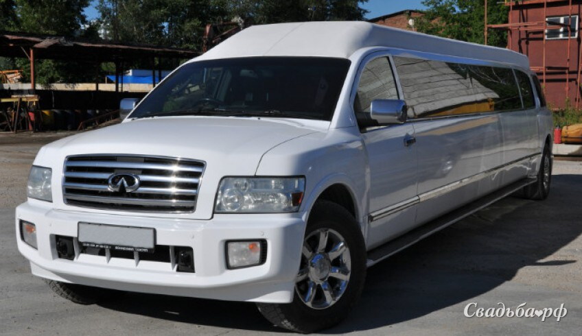 Стильный лимузин Infiniti QX 2012 года выпуска с безупречным белым кузовом и панорамными тонированными окнами отличается высоким кожаным салоном на 24 человека, самой современной техникой, оригинальной подсветкой, мягкими диванами и стильными барами со всей необходимой посудой. При заказе данного автомобиля действует специальная скидка.