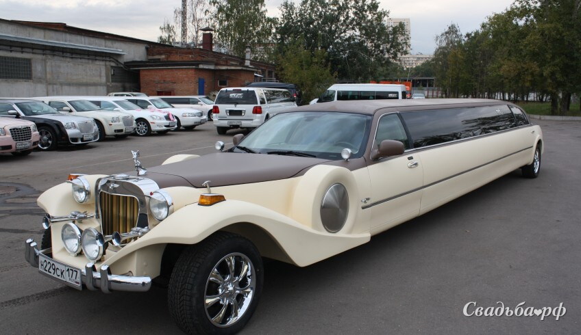 Ретро лимузин Excalibur Phantom с коричнево-бежевым кузовом и хромированными вставками рассчитан на 12 пассажиров. Кожаный салон с мягкими диванчиками, яркой неоновой подсветкой, потолком - звёздным небом и диско-баром поможет вам провести торжественный день незабываемо. Караоке, телевизор, DVD и MP3 проигрыватели создадут атмосферу ночного клуба.