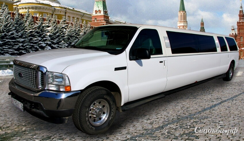 Чудесный лимузин модели Ford Excursion станет отличным автомобилем для пышной и торжественной свадьбы. Вместительный салон рассчитанный на шестнадцать мест отделан дорогой кожей и оснащен самой современной техникой. Эффект лазерного шоу, пол с подсветкой 7 цветов, звездное небо на зеркальном потолке, CD, DVD, КАРАОКЕ, вместительный бар.