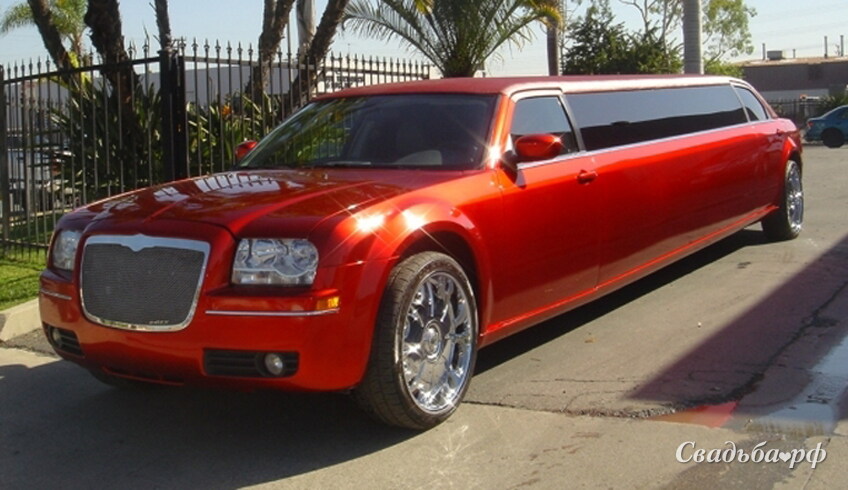 Еще один великолепный лимузин сочетающий в себе роскошь и элегантность - Chrysler 300C необыкновенного красно-оранжевого цвета. Этот лимузин буквально заставляет обратить на себя внимание, поражая своей роскошью и элегантностью. Из оснащения - комбинированный кожаный салон. Пол - с подсветкой. Потолок - звездное небо CD , МР 3 , DVD , LCD-TV