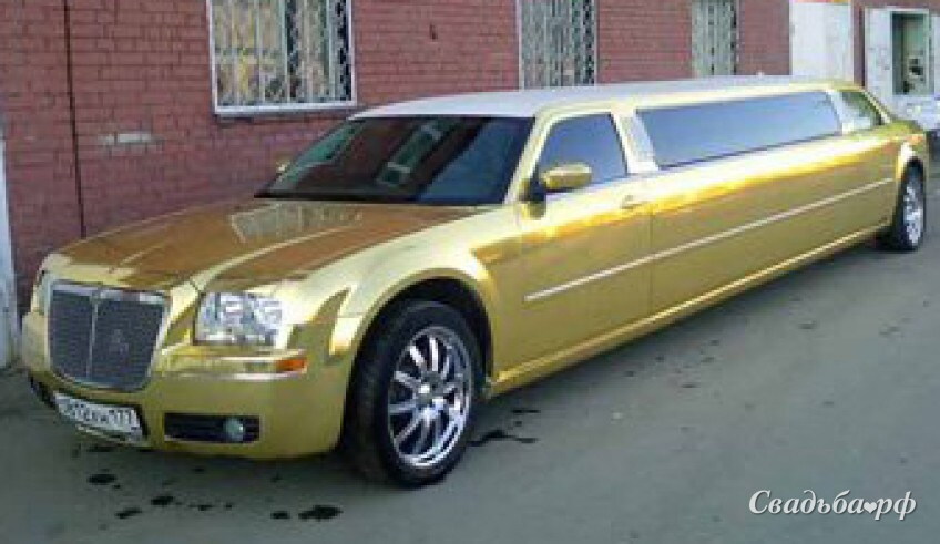 Золотистый лимузин Chrysler 300C тонированными панорамными окнами просто создан для вашего торжества. Просторный кожаный салон на 11 пассажиров оборудован самой современной техникой, комфортными диванами, барами со всей необходимой посудой. Оригинальная подсветка также никого не оставит равнодушным.
