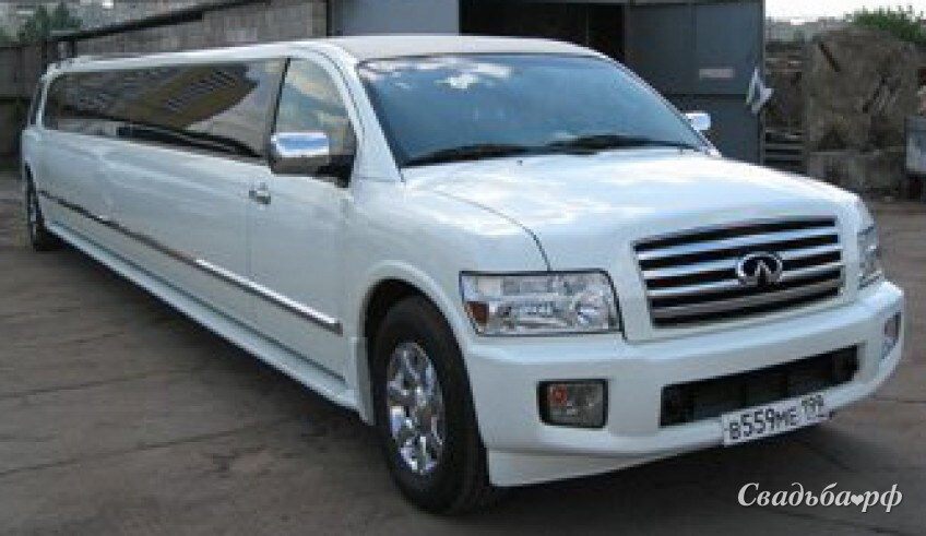 Великолепный лимузин Infiniti QX с белоснежным кузовом и панорамными окнами. Эксклюзивный салон на 22 пассажира декорирован комбинированной светло-серой с темно-серой присобранной кожей. Автомобиль оборудован диско-полом, неоновой подсветкой, зеркальным звездным дождём, TV, DVD, MP3, динамиками и сабвуфером, кондиционером, VIP-зоной.