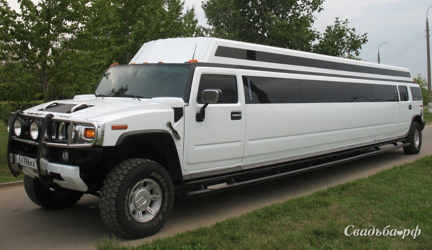 Этот шикарный белый лимузин Hummer Н2 по праву считается одним из роскошнейших автомобилей современности. В этой машине вы гарантированно найдёте всё что нужно для празднования главного события жизни - свадьбы! Современный салон из комбинированной кожи. Диско-потолок, диско-пол. Неоновые подсветки в каждом из 4 баров. Отделение для льда. 6 телевизоров, DVD-плеер, аудиосистема с CD и MP 3 проигрывателями. Автомобиль рассчитан на 28 персон. Год выпуска 2012!