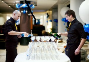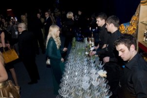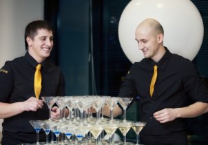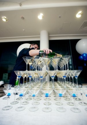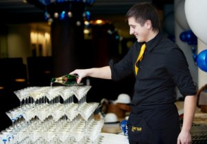 В услугу по установке пирамиды шампанского входит доставка необходимого количества бокалов, инсталляция пирамиды из бокалов, полное проведение шоу