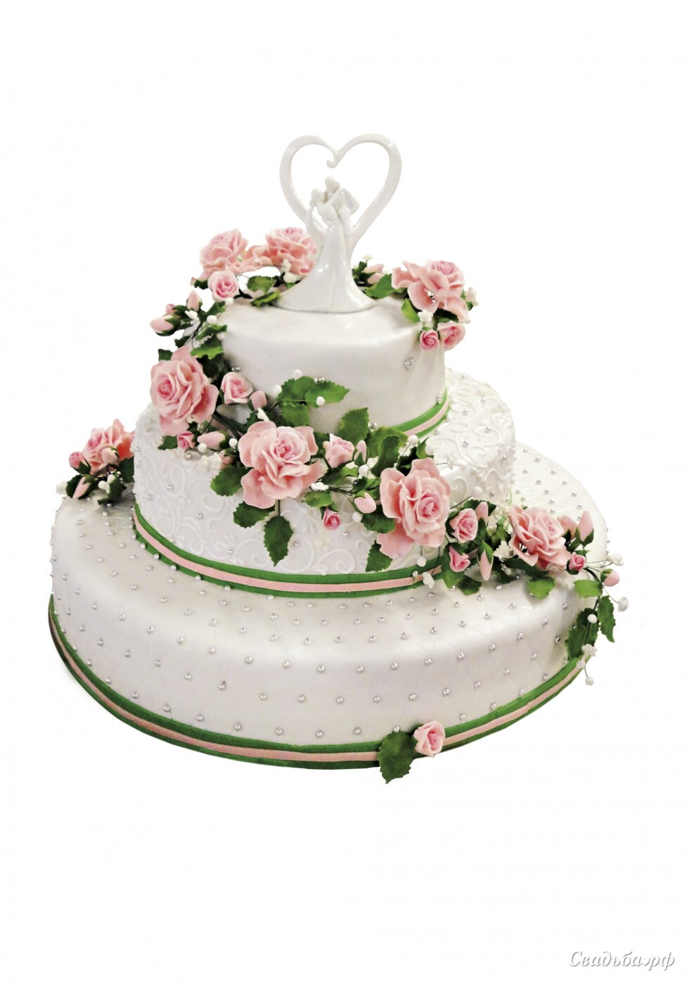 Торт отделан мастикой и украшен сахарными цветами. Свадебная статуэтка оплачивается отдельно. Возможно изменение цветовой гаммы и количества уровней. Основа на ваш выбор.