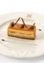 Банановый и карамельный муссы с прослойкой из бананов фламбе на сочном оливковом бисквите и подложке из хрустящего пралине.