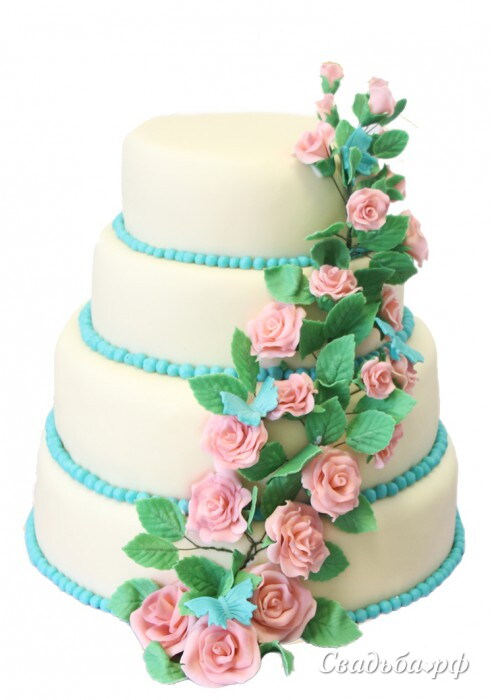 Свадебный торт с сахарными кустовами розами, спускающимся каскадом по 4-м ярусам торта.