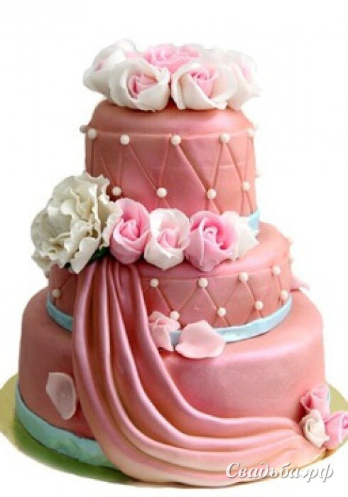 Нежный свадебный торт, украшенный шоколадными розами, сахарным пионом и фалдами. Возможны другие варианты цвета и любая начинка на Ваш выбор. Минимальный рекомендуемый вес 3-х ярусного торта 7 кг, 2-х ярусного торта 5 кг.