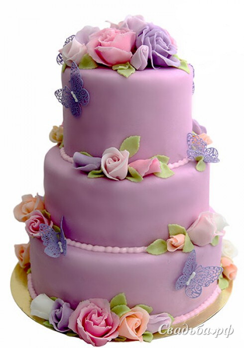 Яркий ярусный торт, украшенный многочисленными шоколадными розами и ажурными бабочками. Возможны другие варианты цвета и любая начинка на Ваш выбор. Минимальный рекомендуемый вес 3-х ярусного торта 8 кг, 2-х ярусного торта 5 кг.