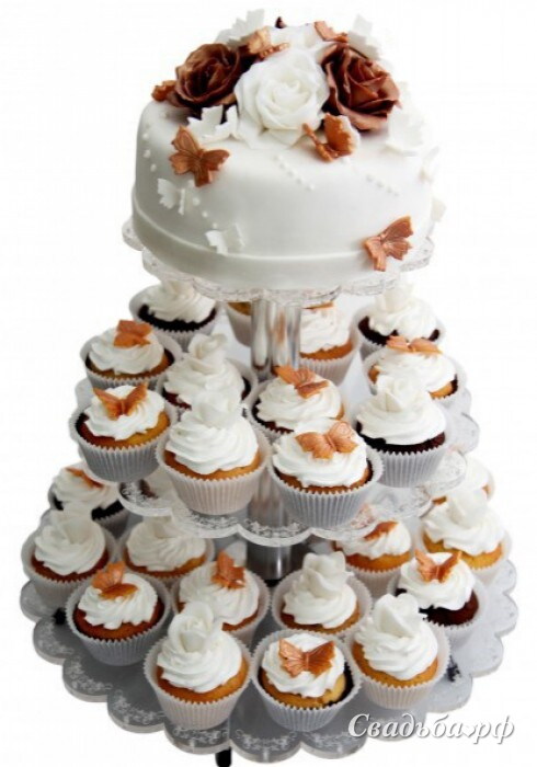 Торт на ярусной подставке. Верхний ярус - торт (от 5 кг), украшенный шоколадными розами и бабочкам. Начинка любая на Ваш выбор. По нижним ярусам расположены пирожные (200г) или кап-кейки (150г), оформленные в общем стиле. Цветовая гамма торта может быть другой.