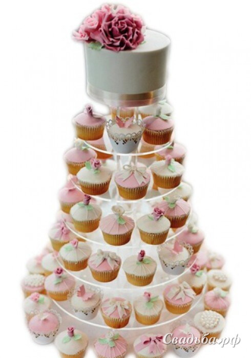 Свадебный торт на подставке. Верхний ярус - небольшой торт (от 2 кг), украшенный сахарными пионами. Начинка-любая на Ваш выбор. По нижним ярусам кап-кейки (150г), оформленные в общем стиле. Цветовая гамма торта может быть другой