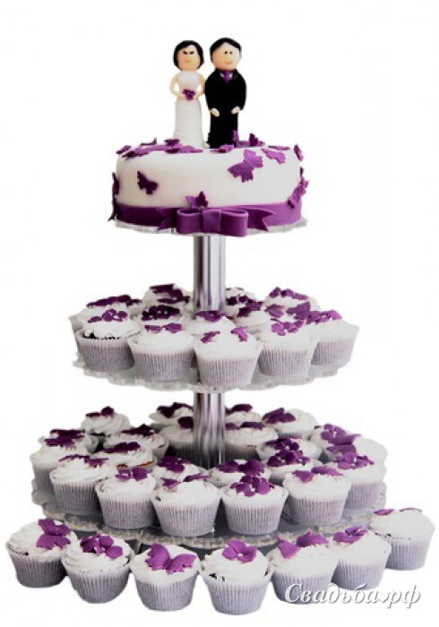 Свадебный торт на ярусной подставке. Верхний ярус - торт (от 2 кг), украшенный фигурками жениха и невесты, начинка любая на Ваш выбор. По нижним ярусам расположены кап-кейки (150г), оформленные в общем стиле. Цветовая гамма торта может быть другой.