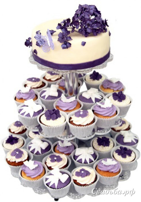 Свадебный торт на ярусной подставке. Верхний ярус - торт (от 5 кг), украшенный сахарными цветами и бабочками, начинка любая на Ваш выбор. По нижним ярусам расположены пирожные (200г) или кап-кейки (150г), оформленные в общем стиле. Цветовая гамма торта может быть другой.