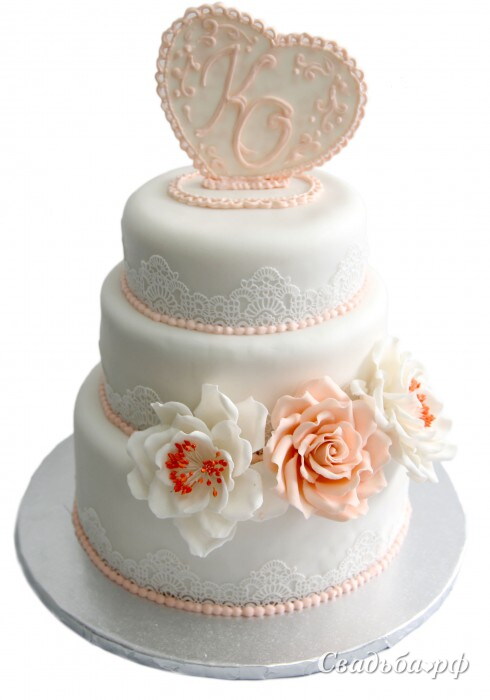 Нежный свадебный торт, украшенный марципановыми цветами и шоколадным сердцем с инициалами. Любая начинка на Ваш выбор. Цветовая гамма торта может быть изменена Минимальный рекомендуемый вес 3-х ярусного торта 7 кг, 2-х ярусного торта 5 кг.
