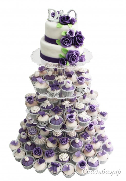 Свадебный торт на подставке. Верхний ярус -торт 5 кг,вес может быть меньше если сделать в один ярус. Начинка-любая на Ваш выбор. По нижним ярусам кап-кейки (150г), оформленные в общем стиле. Цветовая гамма торта может быть другой.