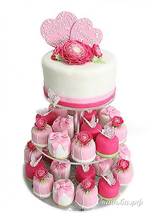 Свадебный торт на ярусной подставке. Верхний ярус - небольшой торт (от 2 кг), украшенный сахарными ранункулюсами, начинка любая на Ваш выбор. По нижним ярусам расположены пирожные (200г)оформленные в общем стиле. Цветовая гамма торта может быть другой.