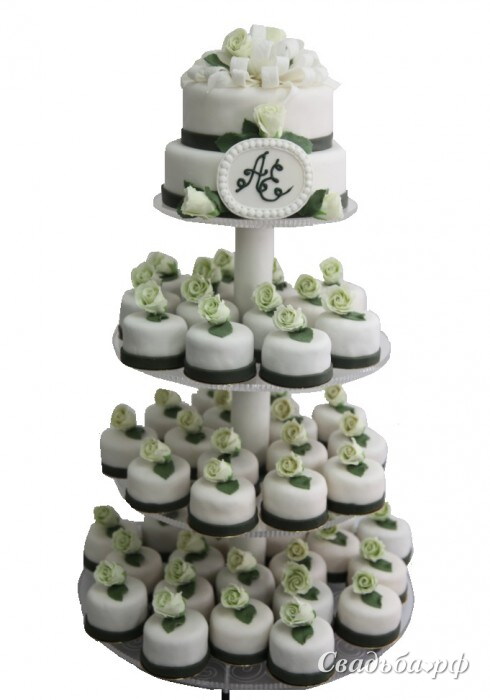 Свадебный торт на ярусной подставке. Верхний ярус -торт 5 кг. Начинка любая на Ваш выбор. По нижним ярусам расположены пирожные (200г)оформленные в общем стиле. Цветовая гамма торта может быть другой. Фигурки на торте так же по Вашему желанию.