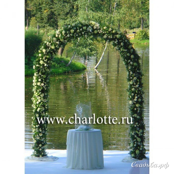 Цветочная арка в бело-зеленой гамме из роз, азиатских лилий (без запаха), белого лизиантуса, бело-зеленой сантини.