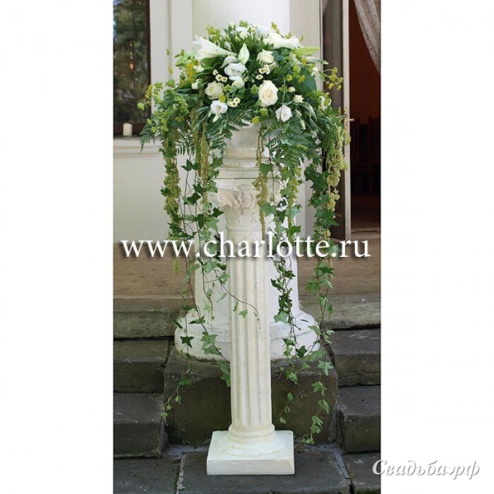 Композиция в бело-зеленой гамме из белых роз, лилий лонгифлорум, бело-зеленой сантини, буплерума, амми, бело-зеленых лизиантусов с декоративной зеленью.