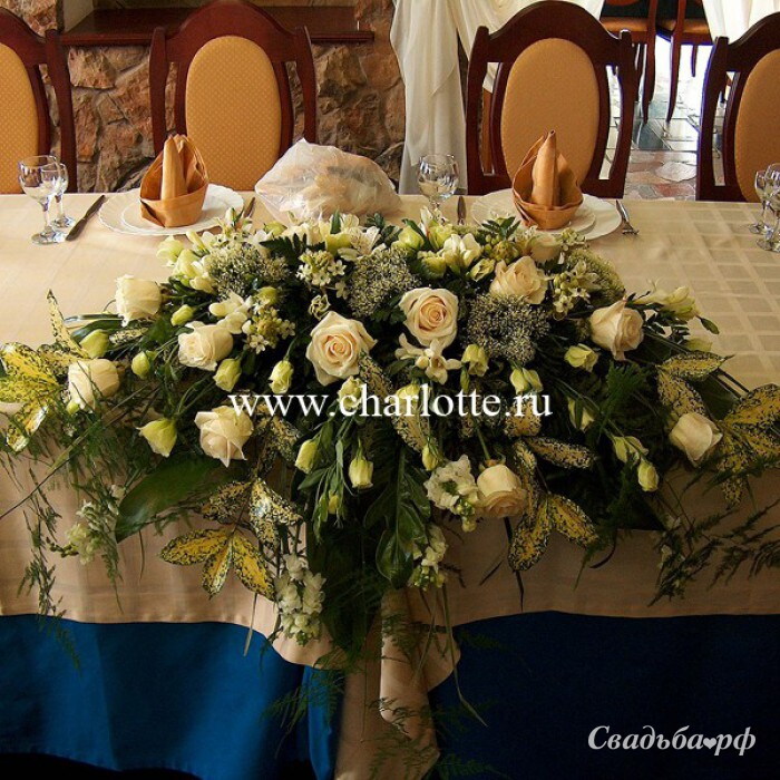 Композиция на президиум из живых цветов. Размер такой композиции 120*50 см, цветовая гамма по Вашему желанию может быть изменена, для этого связывайтесь с нашими операторами по телефону.