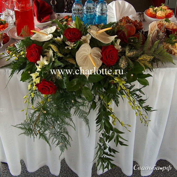 Композиция на президиум в красно-бело-зеленых тонах. Цветовую гамму по Вашему желанию можно изменить, а состав оставить тот же. Размер стандартной композиции 100*50 см